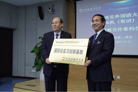 陜鼓集團(tuán)黨委書記、董事長李宏安與西安外國語大學(xué)校長王軍哲代表校企簽訂了戰(zhàn)略合作協(xié)議。西安外國語大學(xué)授予陜鼓“國際化實習(xí)創(chuàng)新基地”牌匾,陜鼓授予西安外國語大學(xué)“國際化人才聯(lián)合培養(yǎng)基地”牌匾。